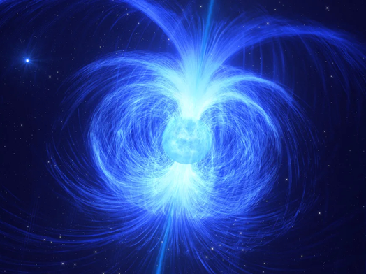 “Magnetar (mag·ne·tar). Noun – from the field of astronomy. A magnetar is a type of neutron star. A neutron star is created when an extremely large star, whose mass is 10 – 25 times that of our sun, enters a supernova event and is crushed into an object with a diameter of only ~20 kilometers / 12 miles. That supernova event caused the crushed star’s subatomic particles, its protons and electrons, to be converted into atomic neutrons, resulting in the neutron star’s hyper-extreme density. A magnetar is type of neutron star whose spin, temperature and strength of its original magnetic field creates a dynamo mechanism that converts heat and rotational energy into magnetic energy of colossal strength, well over a trillion times more powerful than that of the Earth.”